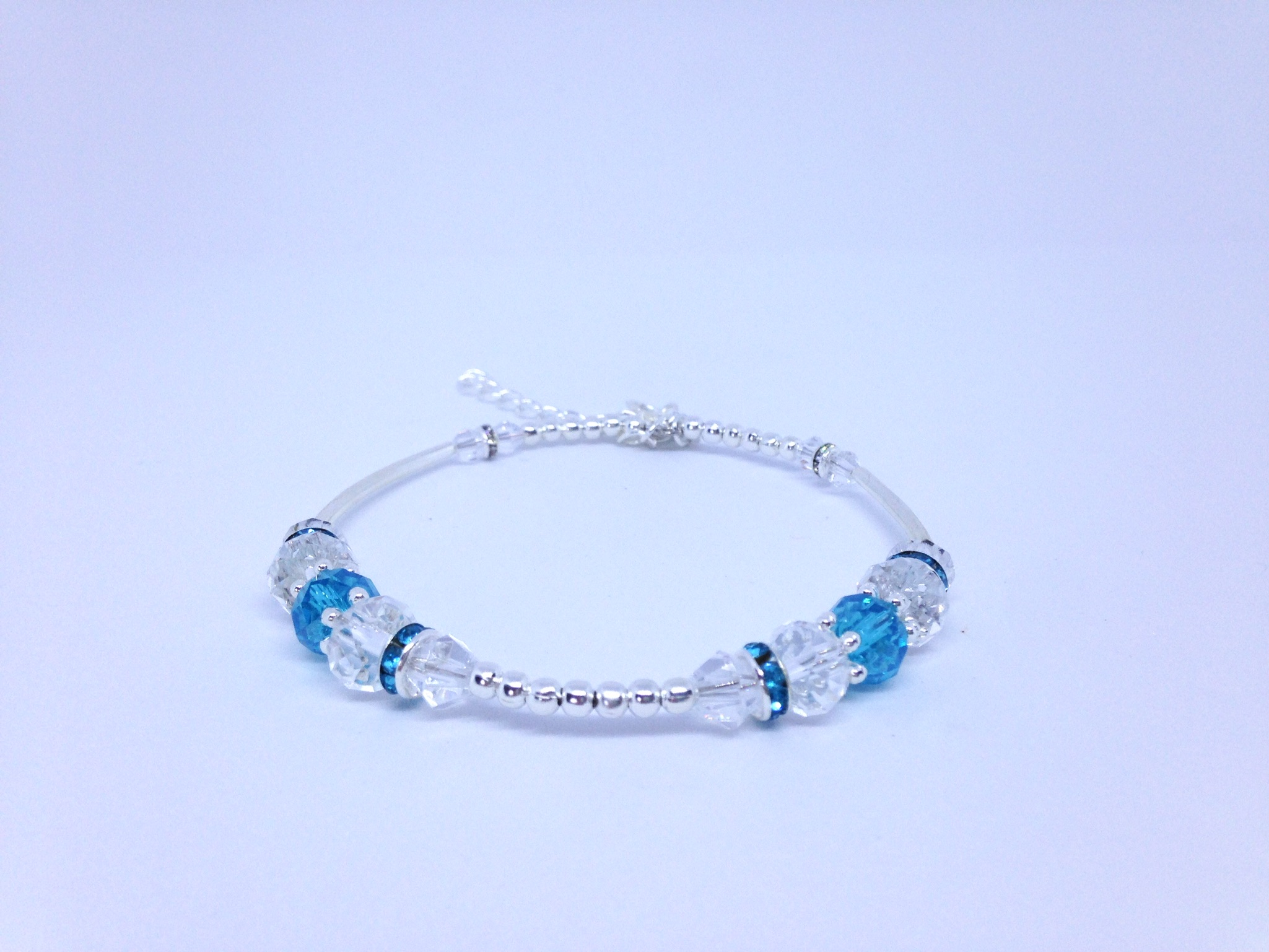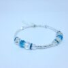 Bracelet mémoire de forme avec éléments turquoises et transparents.