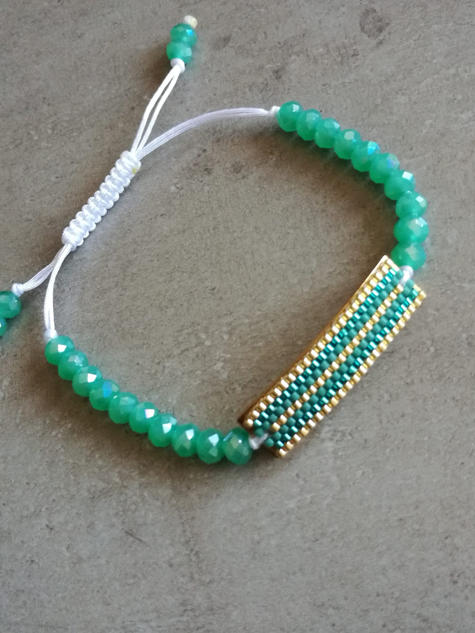 Le tour du bracelet est fait avec des perles de cristal de chine ton vert