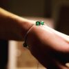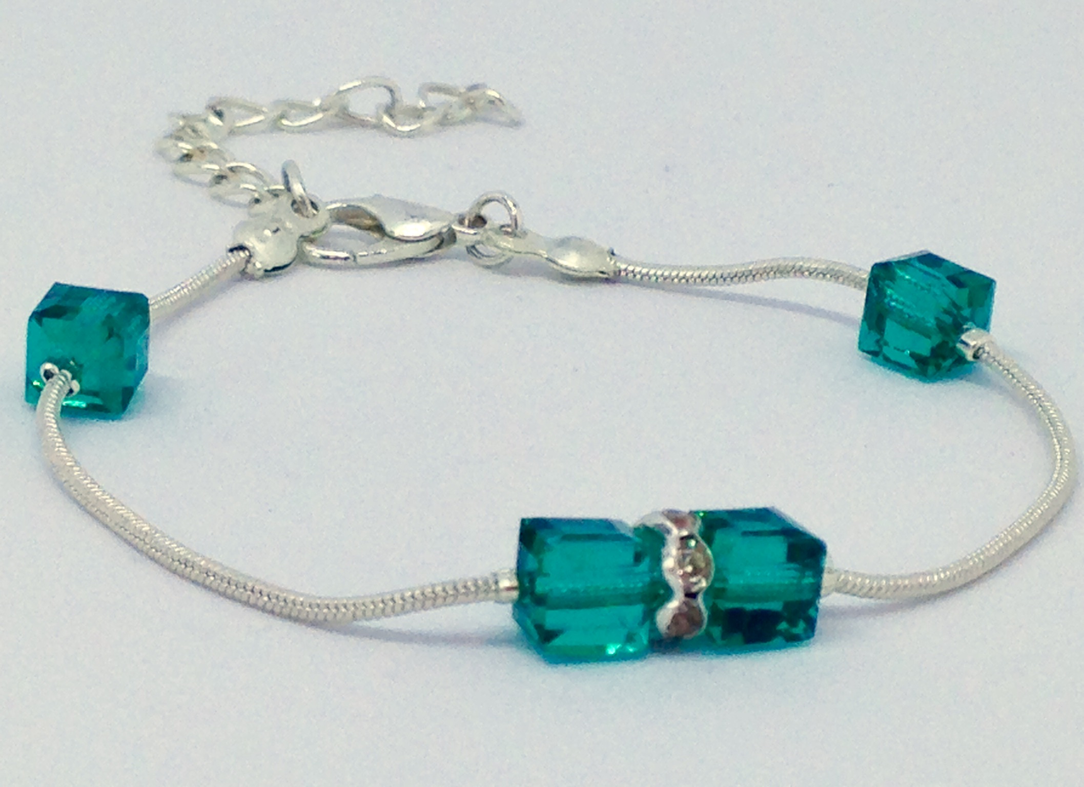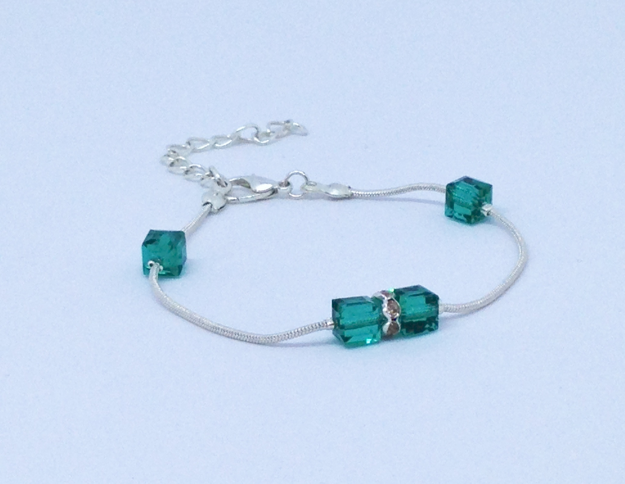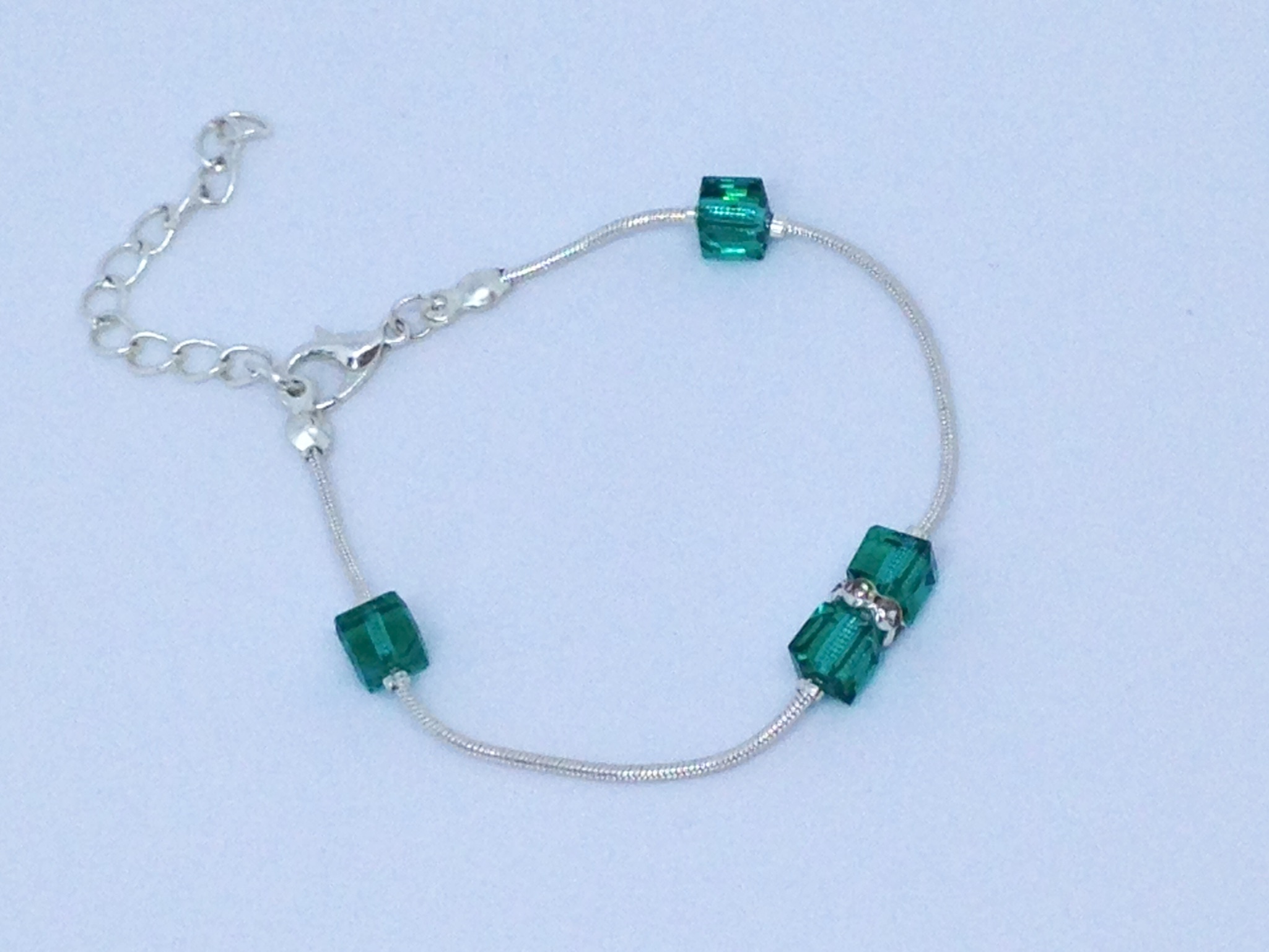 Bracelet tendance avec carrés vert-émeraude en verre poli sur sa chaîne serpent argentée.