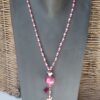 Collier constitué d’une grosse perle en céramique rose fushia et de petites perles en pierres naturelles roses claires, roses fushias et dorées. Petits pompons assortis.