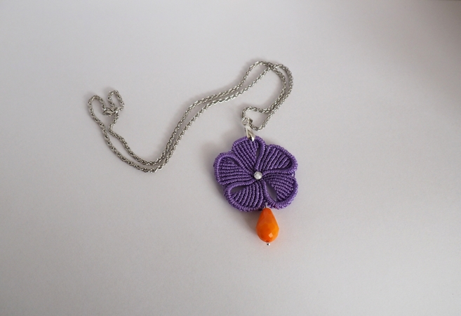 Joli et élégant pendentif réalisé à la main avec la technique du macramé et représentant une fleur; elle est discrètement décorée en son centre avec un petit strass argenté.