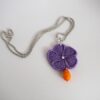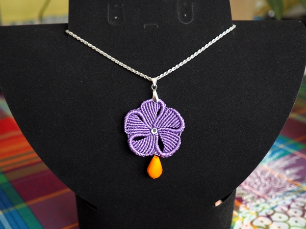 Cette fleur violette est mise en valeur par l’ajout d’une perle facettée en forme de goutte et de couleur orange.